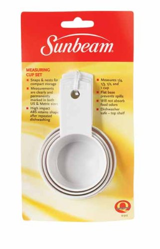 a great durable and compact pocket scale for those who are seeking the on the go high-tech portable scale. The backlit LCD display helps make the numbers viewable and easy to read. The intuitive protective cover provides protection for the scale. With the smooth stainless steel weighing surface clean up is easy.Add a measure of consistency to your kitchen with sturdy and easy-to-read Pyrex glass measuring cups. Choose from the most popular measuring cup sizes within the various available sets. Measurement indicators and the easy to grab handle are designed to make it easy to mix, measure and pour. Whether you are preparing a multi-course meal or simply a snack for one, Pyrex offers products which make food preparation a little easier, from beginning to end. There's no substitute for Pyrex, the original glass bakeware. Introduced 90 years ago and made of a durable, high temperature material, Pyrex remains the ideal medium for safe, dependable food preparation. Use and care: Avoid sudden temperature changes. No stove top or broiler use. Do not overheat oil or butter. Microwave and dishwasher safe. A distinctly American brand—Pyrex glassware is proudly made in the USA, and has been used by generations of cooks and bakers from coast to coast.the MEASURE CUP SET 4PC SUNB by SUNBEAM MfrPartNo 61323Glass is preheated oven and microwave safe. Lids are BPA free, microwave and safe.non-porous glass and won’t absorb stains or odors, making for easy cleaning. Lids are dishwasher safe in the top rack. fridge and freezer safe, making Pyrex perfect for your food storage needs.Add a measure of consistency to your kitchen with the Pyrex 1-qt Measuring Cup that is sturdy and easy-to-read. The easy to grab handle is designed to make it easy to mix, measure and pour.MEASURE CUP SET 4PC SUNB by SUNBEAM MfrPartNo 61323 is best for youHighlights: Color: White Set contains: 1/4, 1/3, 1/2 and 1 cup Snaps and nests for compact storage Measurements marked in US and metric sizes High impact ABS retains shape after repeated dishwashing Flat base prevents spills Will not absorb food odors Top shelf dishwasher safe
