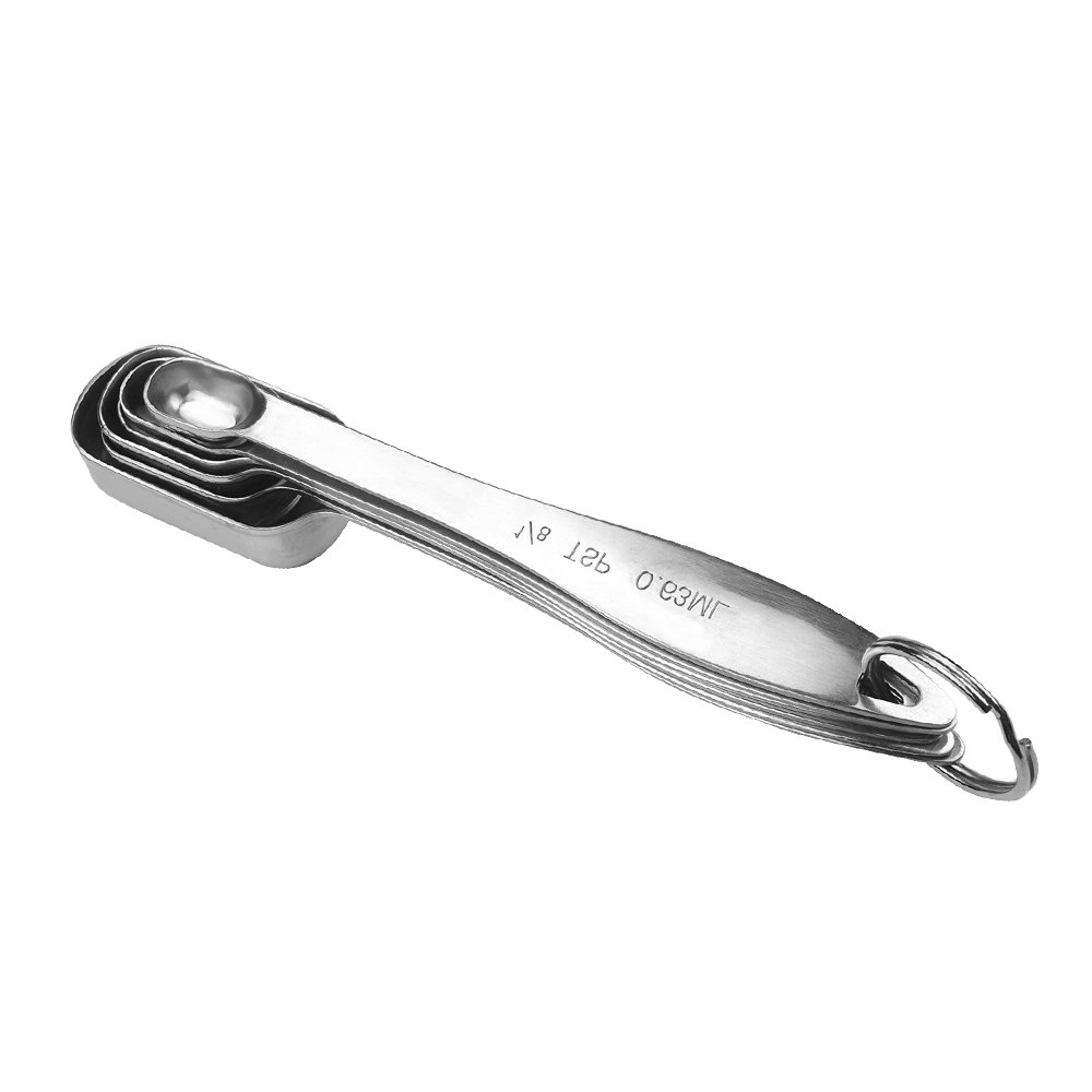 Measuring Spoons - SupplyPro Stainless Steel Rust Resistance Heavy Duty Narrow Shape Measuring Spoons w/ Ring Holder for Measuring Dry and Liquid Ingredients - All in One Set of 6 is best for youSpecification: Material: Stainless Steel Weight: 6oz/170g Color: Silver Size(L*W): 6.5*1in/16.5*2.7cm Features: 1, All size spoons are included in one set,can be used by professional cooks and home chefs. You can easily measure dry and liquid ingredients such as spice, sugar, oil, coffee, wheat, ect. 2, The measuring spoon is made of high quality stainless steel material, very durable and never rust, providing long lasting usage and can be used for a long time. 3, The head of the spoon is designed with perfect narrow shape to fit in to smaller spice jars. And the long handle permits easy access into deep jars and canisters. 4, The spoons are connected together with special holder ring, which can be removed from each individual tool. Also can easily hang up in your kitchen to storage or save space. Set Includes: 1/8 TSP.(0.36ML) 1/4 TSP.(1.25ML) 1/2 TSP.(2.5ML) 3/4 TSP.(3.75ML) 1 TSP.(5ML) 1 TBSP.(15ML)