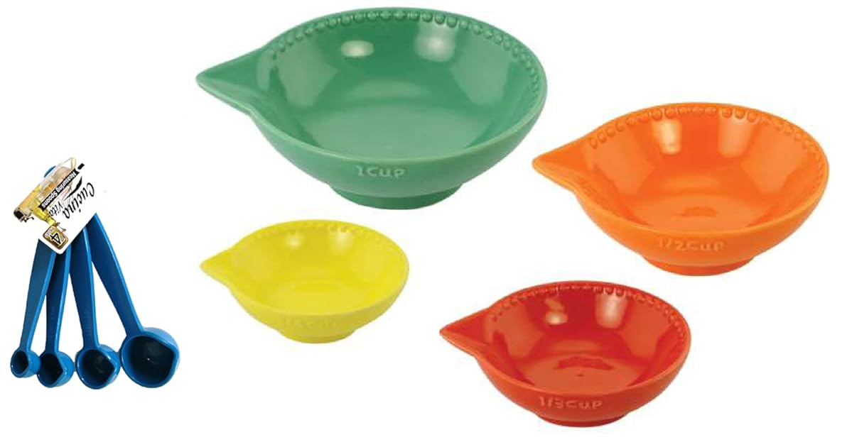 Turquose Orange Red Yellow Nesting Cute Colorful Ceramic Measuring Cups and Turquoise Measuring Spoon Set Unique Stocking Stuffer Christmas Gift for Her Wife Mom Mother in Law is best for youBrighten up the kitchen with this set of measuring cups and measuring spoons.