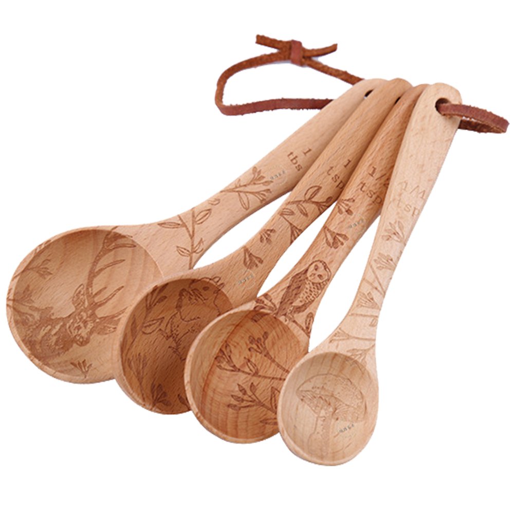 YOULANDA Kitchen Solid Beech Wood Tea Coffee Spice Measuring Spoon Set Of 4 is best for youKitchen Solid Beech Wood Tea Coffee Spice Measuring Spoon Set Of 4 These kitchen essential spoons can meet all your needs when baking and cooking. Beautiful and elegant design with the decorative carvings inside, add more funny to kitchen life. It is a good chance to replace your plastic or metal utensils with wooden. Specification: Material: Beech wood Overall weight: 60g Overall dimension (LxW): 5.1'x1.2', 5.3'x1.5', 5.4'x1.5', 5.9'x1.9' Capacity Includes: 1 x 1-Tbsp (15ml) 1 x 1-tsp (5ml) 1 x 1/2-tsp (2.5ml) 1 x 1/4-tsp (1.25ml) Color: Wood color