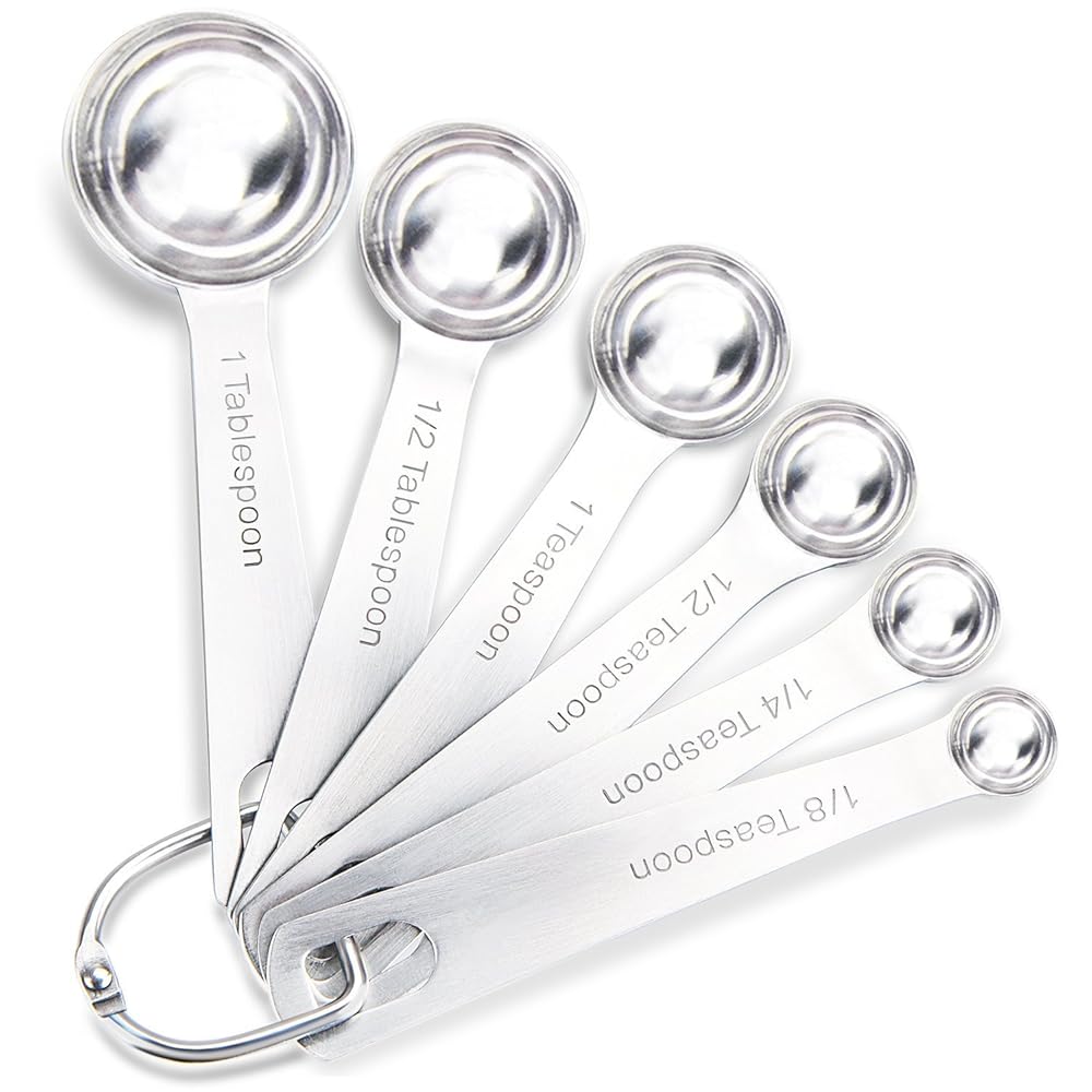 MUYI Stainless Steel Measuring Spoons Set of 6 for Measuring Liquid and Dry Ingredients for Baking and Cooking is best for youStainless Steel Measuring Spoons set of 6 for Measuring Liquid and Dry Ingredients Accurate Quality for Baking and CookingSizes: 1 tablespoon (1 Tbsp, 15 ml metric measuring spoon) 1/2 tablespoon (1 Tbsp, 7.5 ml metric measuring spoon) 1 teaspoon (1 tsp, 5 ml metric measuring spoon) 1/2 teaspoon (1/2 tsp, 2.5 ml metric measuring spoon) 1/4 teaspoon (1/4 tsp, 1.25 ml metric measuring spoon) 1/8 teaspoon (1/8 tsp, 0.625 ml metric measuring spoon)