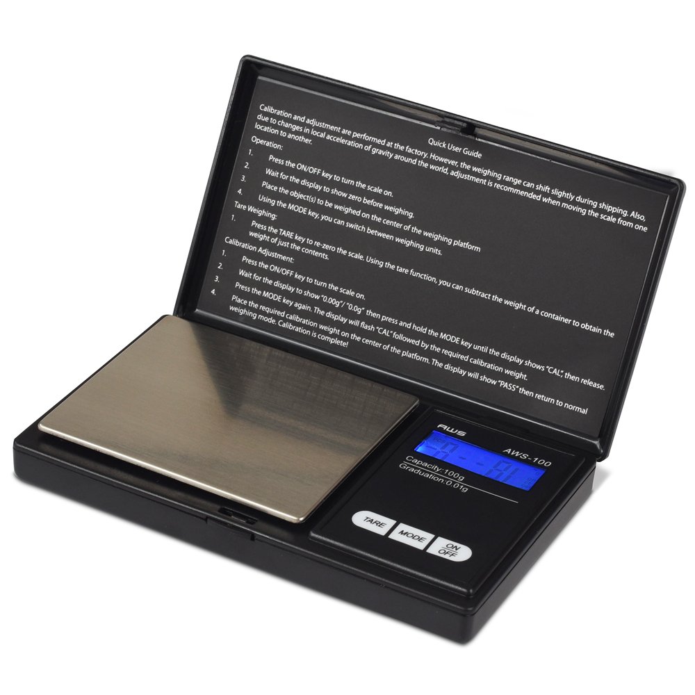 Precision Pocket Scale 100g is best for youPrecision Pocket ScaleDurable and compact pocket scale for those who are seeking the on the go high-tech portable scale. The backlit LCD display helps make the numbers viewable and easy to read. The intuitive protective cover provides protection for the scale. With the smooth stainless steel weighing surface clean up is easy. Push buttons on the scale give you full control such as: switching modes grams ounces troy ounces pennyweights and tarring. This checkbook size scale offers great range from 100 grams to as little as 0.01 of a gram. Capacity of 100 grams (3.528oz). Readability of 0.01 grams 90.001oz. Flip-open lid protects the delicate weighing surface. Linearity of ±2d. Backlid LCD. 3-5 seconds of stabilization time. Calibration Weight of 100 grams (not included). 3 length x 5 width x 0.8 height. Platform Dimensions: 2.5 length x 3 width. Capacity of 100 grams (3.528oz). Powered by 2 x AAA Batteries (included.) 10 year limited warranty. Stainless steel weighing plarform.