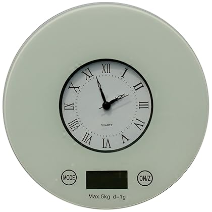 IFRESH Digital Kitchen Scale with Quartz Clock, White is best for youColor:White Take the guesswork out of cooking with the fresh digital kitchen scale, which lets you accurately weigh ingredients while cooking. It has a half-inch, LCD display with backlighting for easy reading. Its tare function provides accurate results without taking the container's weight into account. Easy to use multifunction scale - perfect for cooks, dieters, and families. This electronic food scale has a glass top that resists staining and food carry over. Plus, there's an automatic, shutoff function. This digital kitchen scale can weigh up to 11 pounds of food and its battery powered. Once you are done using the fresh digital kitchen scale, it becomes a cool roman numeral design quartz clock. You can hang on the wall in your kitchen to use as a clock for your prep and cook time, or as decor. Doesn't take up space on your counters.