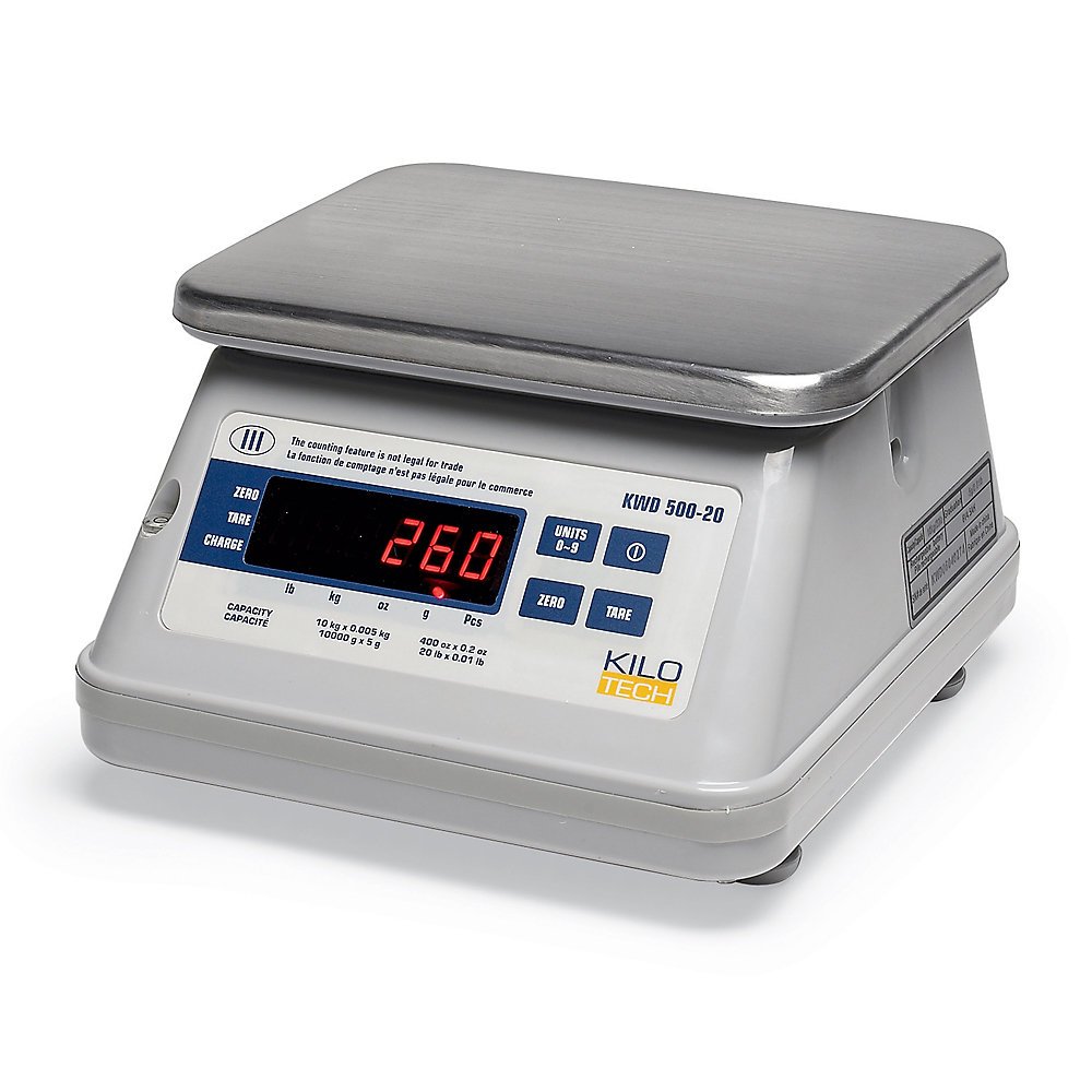 Kilotech Bench Scale - 20 Lbs./10 Kg Capacity is best for youKILOTECH Bench Scales feature LED displays on front and rear of scale making it easy to see the readings from both sides of your worktable. Removable stainless steel platform and adjustable feet. Water- and dust-resistant. Secondary counting and tare functions. Four weighing modes: grams, kilograms, ounces, and pounds. Four direct keys: zero, tare, units/counting, and on/off. Operates on AC power or rechargeable battery (both included). NOTE: Scale weighs load only in the listed increments.