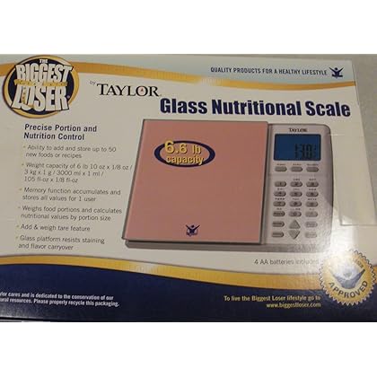 The Biggest Looser Glass Nutritional Scale- Pink is best for youGlass Nutritional Scale6.6 Pound Capacity calculates 11 nutritional Values for 1400 FoodsEasy Food Look Up Ability To add and Store up to 50 new food recipes. Memory Function accumulates and stores all values for one userWeighs Food portions and calculates nutritional values by portion size.4 AA Batteries included