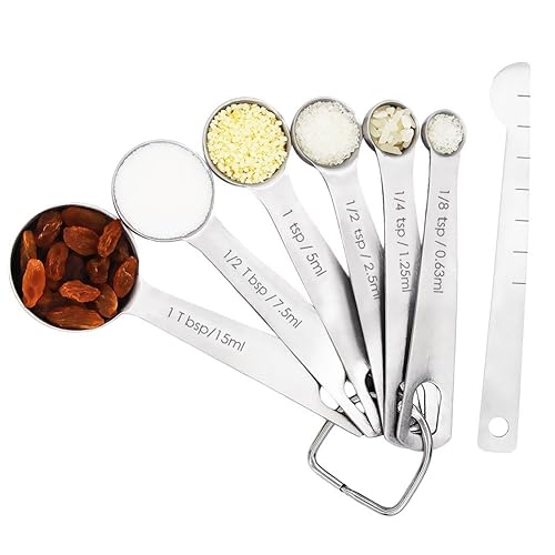 ✔ Engraved Measurement Markings - do not fade, wash off or wear out like printed ones✔ Superior Quality Stainless Steel - Rust Proof✔ Lightweight yet Sturdy and Durable✔ Food grade vibrant color silicone which offers firm grip and stylish look✔ Precision engineering to ensure accurate measurements✔ Ideal shape to easily stack them into each other for easy storage✔ Removable Silicone Grip for Ease of Cleaning✔ Sturdy Locking Rings to Hold corresponding pieces together✔ Elegant Surface Finish✔ Easy Measurements - Set of 10 different pieces to let you take a range of measurements✔ Long, narrow measuring spoons to fit into small spice jarsthe Stainless Steel Measuring Spoons, BeautyWill 18/8 Stainless Steel Measure Spoon Set of 7 with Measuring Stick for Baking and Cooking Modernize your home kitchen with user-friendly portioning simplicity. Easily measure your garnishes and ingredients by grams, milliliters, pounds and ounces with the quick unit conversion button. The digital scale features a handy auto-tare function so you can easily measure ingredients in a dish without having to do any math, so you can cut down on prep time to enjoy your meal. The scale is designed with a smooth stainless steel platform for easy cleaning and maintenance. Accent your countertop with a modern look. Otherwise, the slim design makes it easy to store in any kitchen cabinet or drawer. Although the scale is slim, it maintains the durability to withstand up to 11 pounds of weight. When the capacity is surpassed, the scale will alert you with a safe overload indication. Whether you're a beginner or a seasoned chef, this digital scale has the simplicity and practicality to create the perfect kitchen creations.Stainless Steel Measuring Spoons, BeautyWill 18/8 Stainless Steel Measure Spoon Set of 7 with Measuring Stick for Baking and Cooking is best for youSize:Round Here you found the Best Companion for Baking and Cooking - BeautyWill Stainless Steel Measuring Spoons Set of 7! 1,EASY AND FUNY COOKING: Measuring Spoons Set of 7 including 6 measuring spoons and 1 measuring Stick,all of the spoons is imprinted with the measurement.Each spoon is clearly marked with ml and teaspoon and tablespoons measurements. 2,FOOD GRADE 18/8 STAINLESS STEEL AND CRAFTSMANSHIP: Make of High quality stainless steel ,Seamless molding technology make the spoons streamline fashion look,and easy to clean and avoid bacteria. 3,D RING FOR STORAGE: easy to take on or off for all of the spoons and measuring ruler,good for dry and storage after cooking. 4,HIGHLY SATIN BRUSHED WITH BEST QUALITY, Handle is imprinted with the measurement,Durable, never rust,safe for dishwasher, it is your best companion for your cooking. 5,Measuring Spoons includes: 1-Tablespoon (15ML) * 1 1/2-Tbsp (7.5ML) * 1 1-tsp (5ML) * 1 1/2-tsp (2.5ML) * 1 1/4-tsp (1.25ML) * 1 1/8-tsp (0.63ML) * 1 measuring stick * 1 LIFETIME GUARANTEE: If you unsatisfied with the quality of our product, you can return it to us and receive a 100% refund. Now add the BeautyWill Stainless Steel Measuring Spoons Set of 7 to the shopping cart and begin your happy cooking soon!