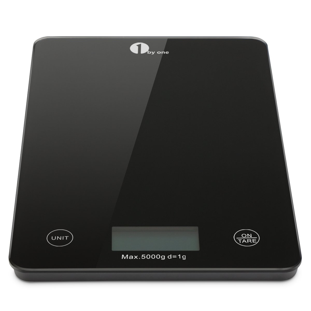 • The 1byone Professional Touch Digital Kitchen Scale, Electronic Home Scale, Elegant Black Tempered Glass, Weight Max 5000g 11lbs, Black is a
