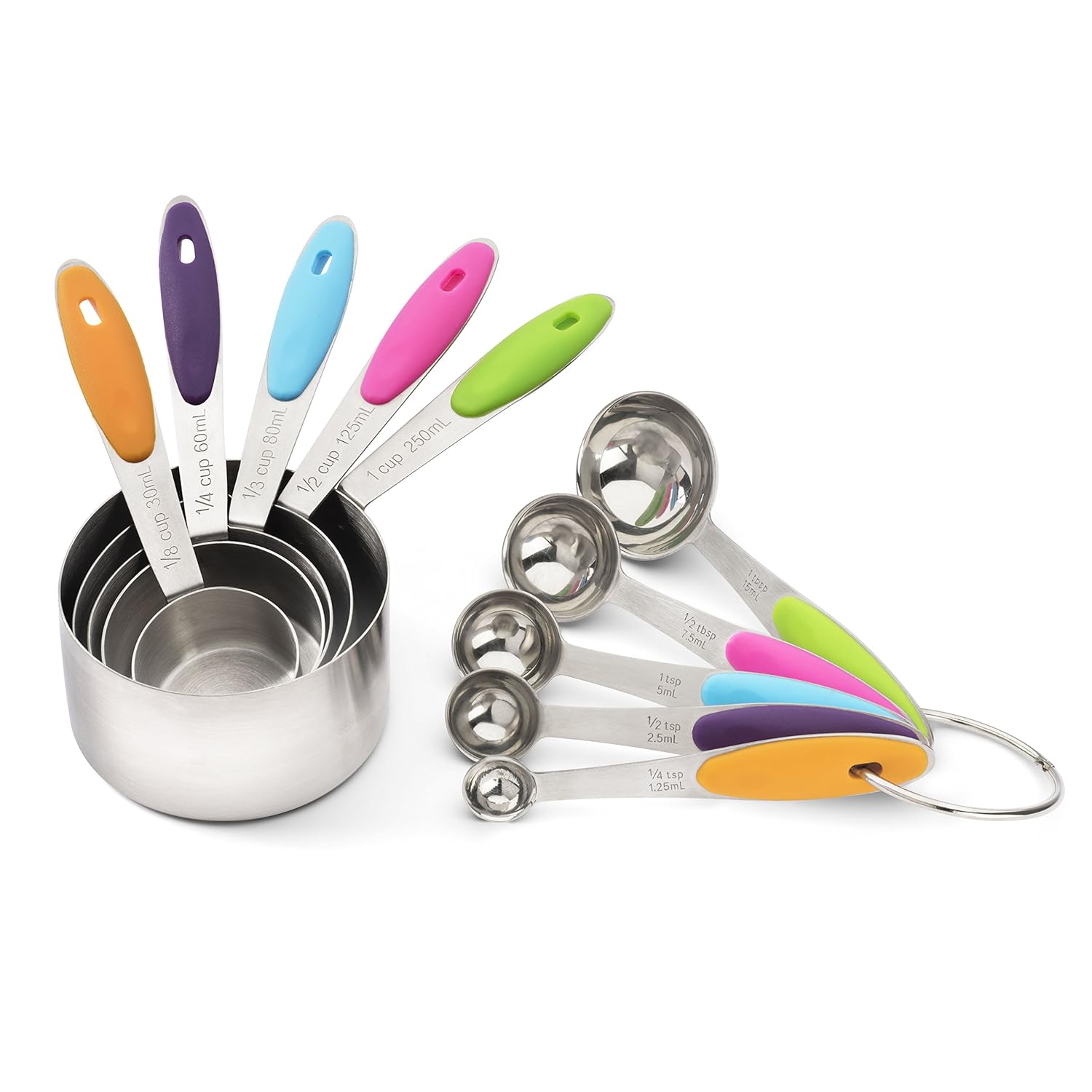 ✔ Engraved Measurement Markings - do not fade, wash off or wear out like printed ones✔ Superior Quality Stainless Steel - Rust Proof✔ Lightweight yet Sturdy and Durable✔ Food grade vibrant color silicone which offers firm grip and stylish look✔ Precision engineering to ensure accurate measurements✔ Ideal shape to easily stack them into each other for easy storage✔ Removable Silicone Grip for Ease of Cleaning✔ Sturdy Locking Rings to Hold corresponding pieces together✔ Elegant Surface Finish✔ Easy Measurements - Set of 10 different pieces to let you take a range of measurements✔ Long, narrow measuring spoons to fit into small spice jarsthe Measuring Cup and Measuring Spoon Set in Stainless Steel with Silicone Handles by Housely. Decorative Non-magnetic Metal For Dry Measurement Without A Spout. Measurements In Both US and Metric. Modernize your home kitchen with user-friendly portioning simplicity. Easily measure your garnishes and ingredients by grams, milliliters, pounds and ounces with the quick unit conversion button. The digital scale features a handy auto-tare function so you can easily measure ingredients in a dish without having to do any math, so you can cut down on prep time to enjoy your meal. The scale is designed with a smooth stainless steel platform for easy cleaning and maintenance. Accent your countertop with a modern look. Otherwise, the slim design makes it easy to store in any kitchen cabinet or drawer. Although the scale is slim, it maintains the durability to withstand up to 11 pounds of weight. When the capacity is surpassed, the scale will alert you with a safe overload indication. Whether you're a beginner or a seasoned chef, this digital scale has the simplicity and practicality to create the perfect kitchen creations.Measuring Cup and Measuring Spoon Set in Stainless Steel with Silicone Handles by Housely. Decorative Non-magnetic Metal For Dry Measurement Without A Spout. Measurements In Both US and Metric. is best for youThe Housely measuring cup and measuring spoon set is a professional grade cooking tool for the everyday at home chef! You'll never have a cake fall apart on you again when you bake using these decorative and accurate measuring cups. ➤ 5 Measuring Cup volumes: 1/8 cup, 1/4 cup , 1/3 cup, 1/2 cup, 1 cup ➤ 5 Measuring Spoon volumes: 1/4 tsp, 1/2 tsp, 1 tsp, 1/2 tbsp, 1 tbsp ➤ 2 detachable rings ➤ High quality stainless steel. If you own a cheap set of measuring cups and spoons, you'll easily feel the difference in quality just by the weight of these in your hand. ➤ Capacities in U.S and metric are engraved in the handles of both the cups and spoons. ➤ Dishwasher safe (wash prior to first use)➤ Durable comfortable easy grip silicone handles. The silicone grips can be removed. ➤ Orange, purple, blue, pink and green handles will have your guests commenting in the kitchen about how cool and cute your measuring cups and spoons are. ➤ Flat bottom cups to avoid spills ➤ Long handles make it easy to reach in and out of jars and containers. ➤ Fast and precise measuring of your ingredients. Never worry about using too much flour again! ➤ The last set of measuring cups and measuring spoons you will ever need to buy. Packaging: No messy stickers or labels to remove! This set comes packaged in the box you see in the listing images above. Inside the box the set is covered with a plastic sleeve to prevent scratches during shipping. 100% Money Back Guarantee From Housely Housely is so confident that this will be the best and last set of measuring cups and spoons that you ever buy, that we give our customers a 90 day, no questions asked, 100% money back guarantee.