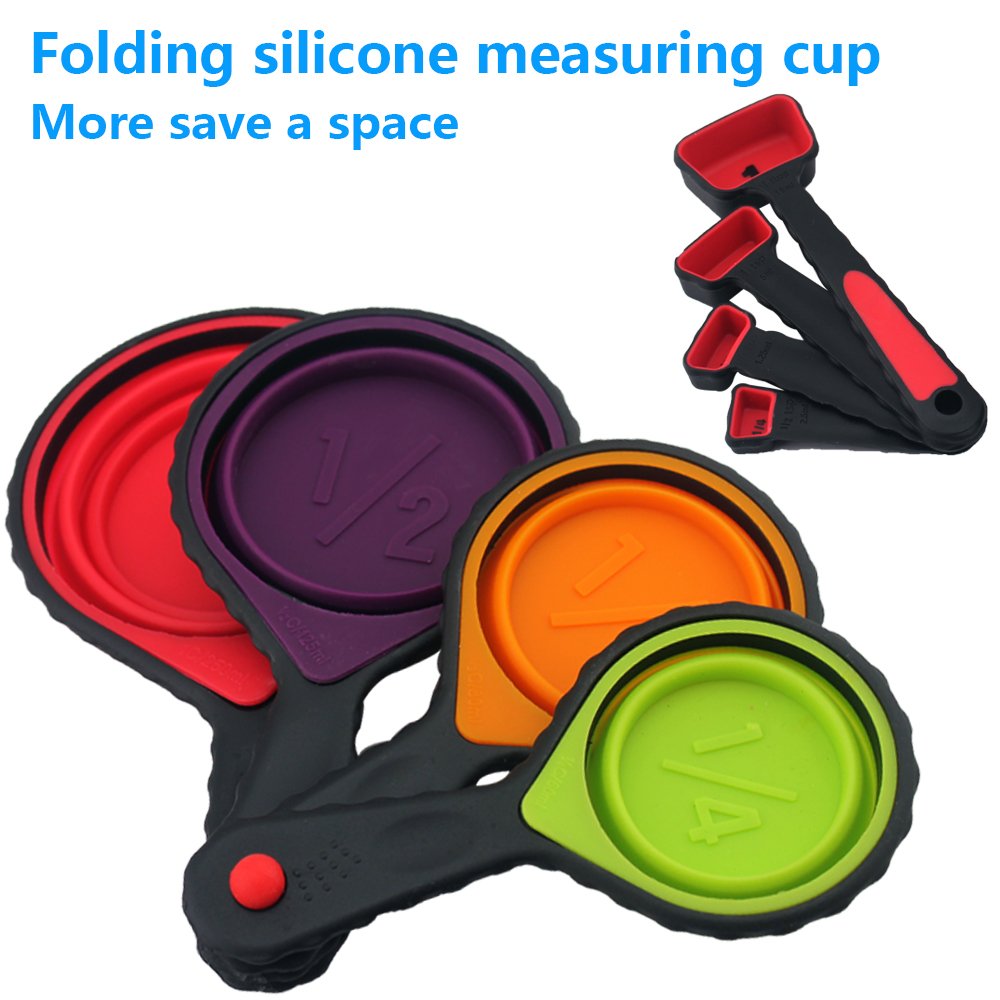 • The FATCHOI Portable Silicone Measuring Cups & Red Measuring Spoons Set, Collapsible 8-Piece Set, 8 Sizes is a