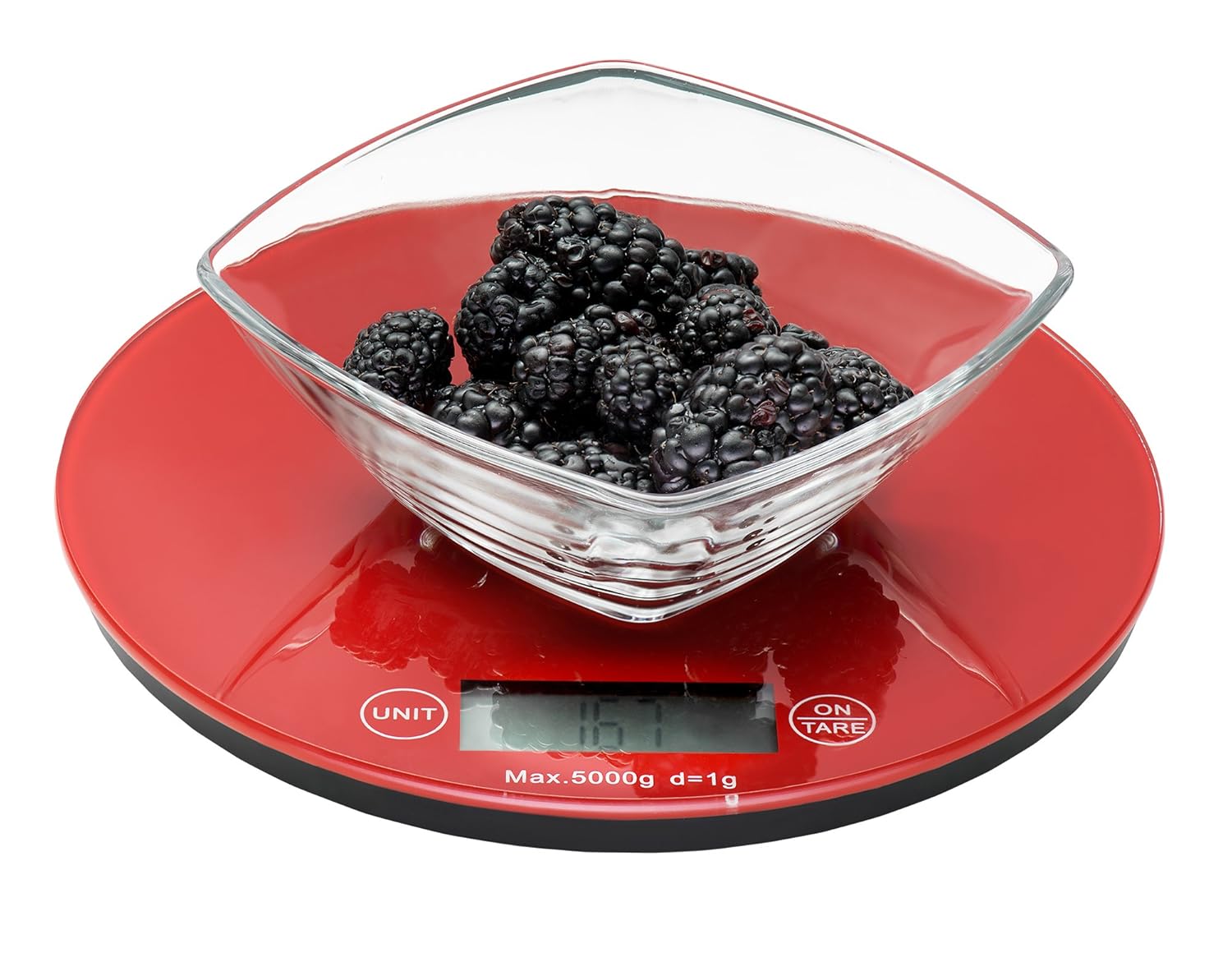 ✔ Engraved Measurement Markings - do not fade, wash off or wear out like printed ones✔ Superior Quality Stainless Steel - Rust Proof✔ Lightweight yet Sturdy and Durable✔ Food grade vibrant color silicone which offers firm grip and stylish look✔ Precision engineering to ensure accurate measurements✔ Ideal shape to easily stack them into each other for easy storage✔ Removable Silicone Grip for Ease of Cleaning✔ Sturdy Locking Rings to Hold corresponding pieces together✔ Elegant Surface Finish✔ Easy Measurements - Set of 10 different pieces to let you take a range of measurements✔ Long, narrow measuring spoons to fit into small spice jarsthe Weigh To Go! Digital Food Scale - Red Digital Kitchen Scale Measures Lb, Oz, Ml and Gram Scale Features Easy Clean Smooth Glass Top, Touch Button Operation, Tare Button and Super Sleek Low Profile Modernize your home kitchen with user-friendly portioning simplicity. Easily measure your garnishes and ingredients by grams, milliliters, pounds and ounces with the quick unit conversion button. The digital scale features a handy auto-tare function so you can easily measure ingredients in a dish without having to do any math, so you can cut down on prep time to enjoy your meal. The scale is designed with a smooth stainless steel platform for easy cleaning and maintenance. Accent your countertop with a modern look. Otherwise, the slim design makes it easy to store in any kitchen cabinet or drawer. Although the scale is slim, it maintains the durability to withstand up to 11 pounds of weight. When the capacity is surpassed, the scale will alert you with a safe overload indication. Whether you're a beginner or a seasoned chef, this digital scale has the simplicity and practicality to create the perfect kitchen creations.Weigh To Go! Digital Food Scale - Red Digital Kitchen Scale Measures Lb, Oz, Ml and Gram Scale Features Easy Clean Smooth Glass Top, Touch Button Operation, Tare Button and Super Sleek Low Profile is best for youColor:Red Introducing the digital kitchen food scale by Weigh to Go! This beautiful, elegant red digital kitchen scale will grace your kitchen décor while helping you perfect your meals and snacks. Great for the chef or the homemaker - whether you are cooking or baking professionally, measuring your food for a diet, or just trying to create that perfect dinner, you can trust this digital food scale to get the job done right! Standing at just over half an inch in height, and 7.25 inches in diameter, this sleek scale looks great when left out on the counter. A quick wipe with a damp cloth easily cleans the flat glass surface. The command keys are touch operated, leaving no space or crevice for food and stains to gather in over time. The scale measures pounds, ounces, grams, and milliliters. The measuring increments are 0.001 pounds, 0.1 ounces, 1 gram and 1 milliliter. The scale can measure weight up to 11 pounds. Using this scale is extremely easy. Tap the power/tare button to turn on, tap the unit button to switch between units of measure. Tap the power/tare button to zero out the scale. The weigh to go runs on one lithium battery (included), and the power saving auto shut-off feature automatically turns the scale off after 1 minute of inactivity.