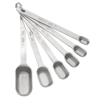 ✔ Engraved Measurement Markings - do not fade, wash off or wear out like printed ones✔ Superior Quality Stainless Steel - Rust Proof✔ Lightweight yet Sturdy and Durable✔ Food grade vibrant color silicone which offers firm grip and stylish look✔ Precision engineering to ensure accurate measurements✔ Ideal shape to easily stack them into each other for easy storage✔ Removable Silicone Grip for Ease of Cleaning✔ Sturdy Locking Rings to Hold corresponding pieces together✔ Elegant Surface Finish✔ Easy Measurements - Set of 10 different pieces to let you take a range of measurements✔ Long, narrow measuring spoons to fit into small spice jarsthe HIC Liquid Dry Spice Jar Sugar Seasoning Measuring Spoons, Heavyweight 18/8 Stainless steel, Set of 6 Spoons Modernize your home kitchen with user-friendly portioning simplicity. Easily measure your garnishes and ingredients by grams, milliliters, pounds and ounces with the quick unit conversion button. The digital scale features a handy auto-tare function so you can easily measure ingredients in a dish without having to do any math, so you can cut down on prep time to enjoy your meal. The scale is designed with a smooth stainless steel platform for easy cleaning and maintenance. Accent your countertop with a modern look. Otherwise, the slim design makes it easy to store in any kitchen cabinet or drawer. Although the scale is slim, it maintains the durability to withstand up to 11 pounds of weight. When the capacity is surpassed, the scale will alert you with a safe overload indication. Whether you're a beginner or a seasoned chef, this digital scale has the simplicity and practicality to create the perfect kitchen creations.HIC Liquid Dry Spice Jar Sugar Seasoning Measuring Spoons, Heavyweight 18/8 Stainless steel, Set of 6 Spoons is best for youStyle Name:Set of 6 Spice Spoons HIC’s 18/8 Stainless Steel Spice Measuring Spoons are versatile cooking utensils and a must-have of baking tools for home cooks, pastry chefs and professional chefs. These Measuring Spoons are specially designed with a narrow profile to fit perfectly into the smaller openings of spice jars and small glass bottles to measure out ingredients easily. And, they work for both dry measurements and liquid measurements. Each measuring spoon has longer handles to reach to the bottom of jars easily and has measurements clearly engraved for easy identification. Made from heavyweight 18/8 stainless steel with a beautiful brushed finish to hide fingerprints, HIC’s Spice Spoons are durable and won’t stain or transfer odors between uses. They’re held together with a connecting ring and nest for easy, compact storage and are dishwasher safe for easy cleanup. This Stainless Measuring Spoon Set of 6 standard kitchen measurements includes ⅛, ¼, ½, ¾, and 1-teaspoon plus 1-tablespoon.