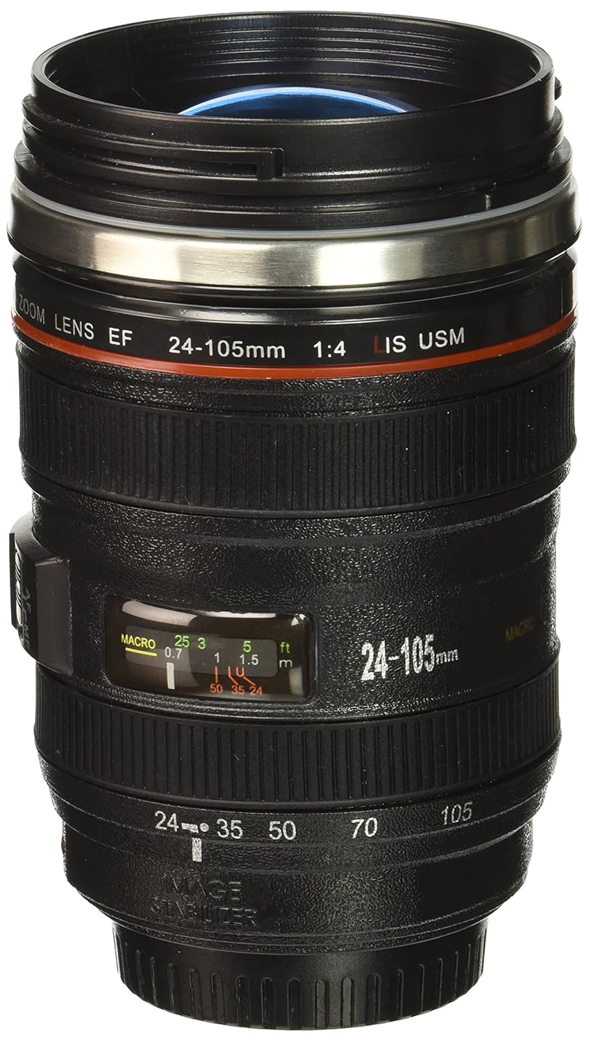 • The Lens Style Stainless Steel Travel Coffee Mug/Thermos with Leak-Proof Lid, 24-105mm, Black with Transparent Lid is a
