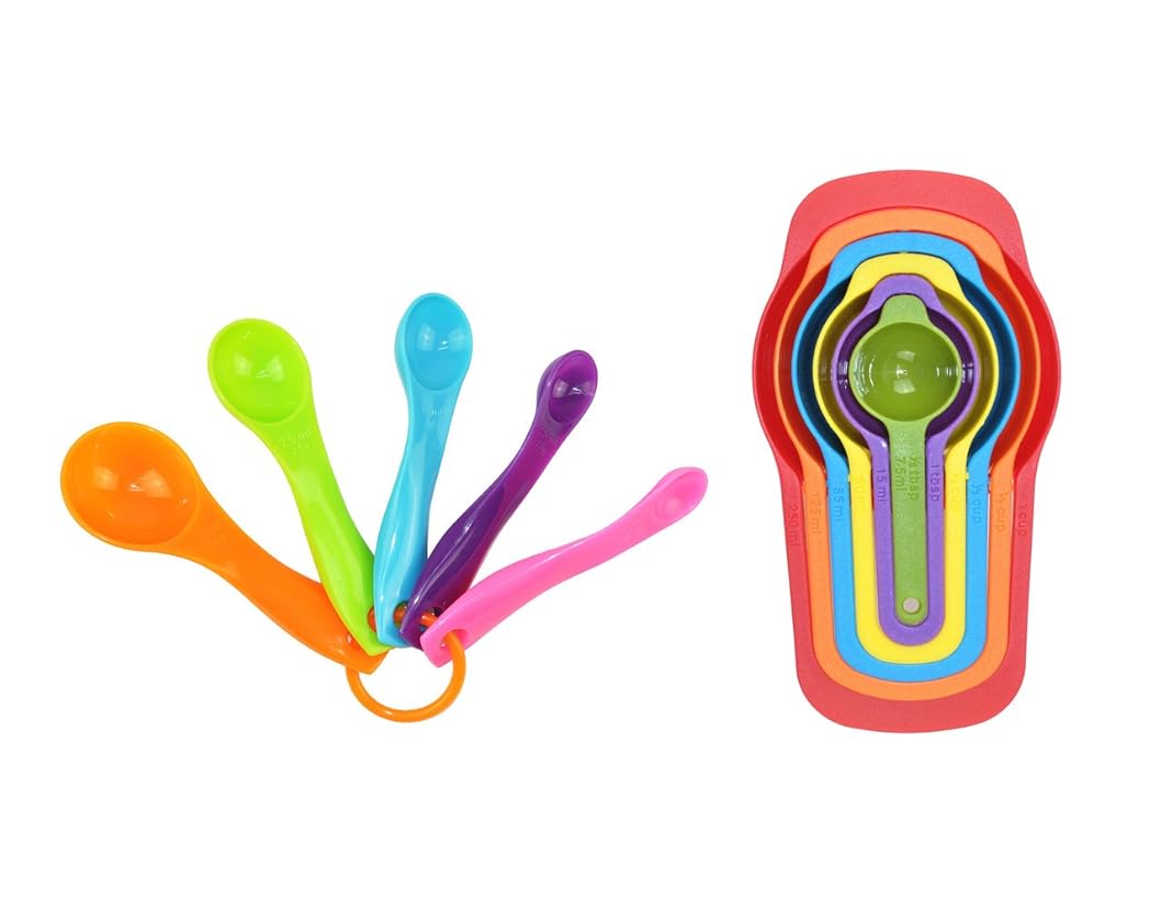 • The Fantasy Life 11 Pcs Set of Plastic Nested Measuring Cups and Spoons Set. Stackable Space Saving Multicolor Design is a