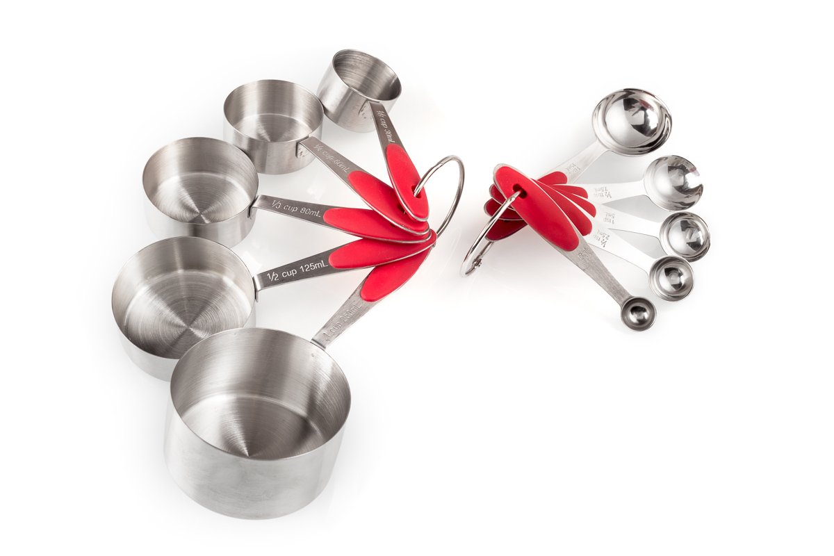 • The Happy Foodies Red Measuring Cups and Spoons Set. Stainless Steel measuring cups 5 pieces and spoons 5 pieces. Collapsible and Metal with Silicone Ergonomic Handles. is a