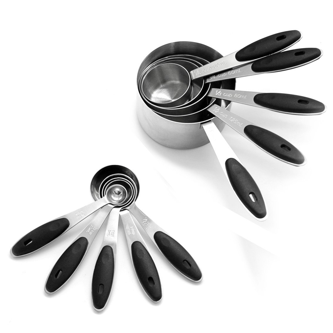 • The Kitchen Stainless Steel Measuring Cups & Spoons Set of 10 Pieces for Dry & Liquid Soft Silicone Handles for Easy Grip Engraved Measurements Black is a