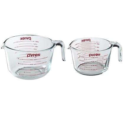 • The Pyrex Prepware Measuring Cup, Clear with Red Measurements, Duo Set, 1-each 1-Quart and 2-Quart is a