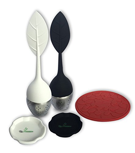 • The Tea Commission Tea Infuser, Steeper Strainer Silicone and Stainless Steel Mesh Basket for Loose Leaf Tea, 2 Pack (Black White + 1 Red Drink Coaster) Eco-friendly Gift or Tea Maker is a