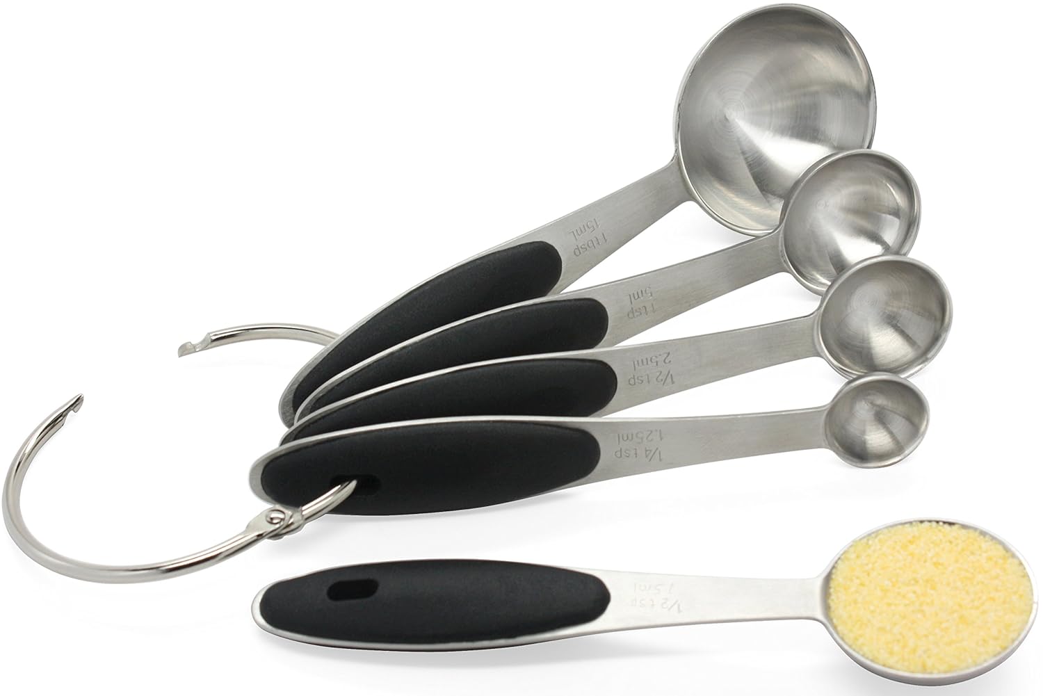 • The 18/8 Stainless Steel Measuring Spoons by Kitchen Zest, 5-Pcs Spoon Set with Engraved Measurements for Measuring Any Ingredients - Soft-Touch Black Ergonomic Handles, Removable Ring Keeps Spoons in One Place is a