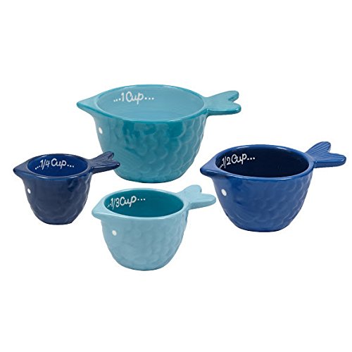 ✔ Engraved Measurement Markings - do not fade, wash off or wear out like printed ones✔ Superior Quality Stainless Steel - Rust Proof✔ Lightweight yet Sturdy and Durable✔ Food grade vibrant color silicone which offers firm grip and stylish look✔ Precision engineering to ensure accurate measurements✔ Ideal shape to easily stack them into each other for easy storage✔ Removable Silicone Grip for Ease of Cleaning✔ Sturdy Locking Rings to Hold corresponding pieces together✔ Elegant Surface Finish✔ Easy Measurements - Set of 10 different pieces to let you take a range of measurements✔ Long, narrow measuring spoons to fit into small spice jarsthe Ceramic Blue Fish Measuring Cup Set Modernize your home kitchen with user-friendly portioning simplicity. Easily measure your garnishes and ingredients by grams, milliliters, pounds and ounces with the quick unit conversion button. The digital scale features a handy auto-tare function so you can easily measure ingredients in a dish without having to do any math, so you can cut down on prep time to enjoy your meal. The scale is designed with a smooth stainless steel platform for easy cleaning and maintenance. Accent your countertop with a modern look. Otherwise, the slim design makes it easy to store in any kitchen cabinet or drawer. Although the scale is slim, it maintains the durability to withstand up to 11 pounds of weight. When the capacity is surpassed, the scale will alert you with a safe overload indication. Whether you're a beginner or a seasoned chef, this digital scale has the simplicity and practicality to create the perfect kitchen creations.Ceramic Blue Fish Measuring Cup Set is best for youThis set of four blue fish-shaped measuring cups will sure to add an ocean or beach feel to your kitchen. 1 cup: 5.5 x 2.75' 1/2 cup: 4.75 x 2.5' 1/3 cup: 4.25 x 2.25' 1/4 cup: 3.75 x 2'. Hand-painted Earthenware. Includes set of 4.
