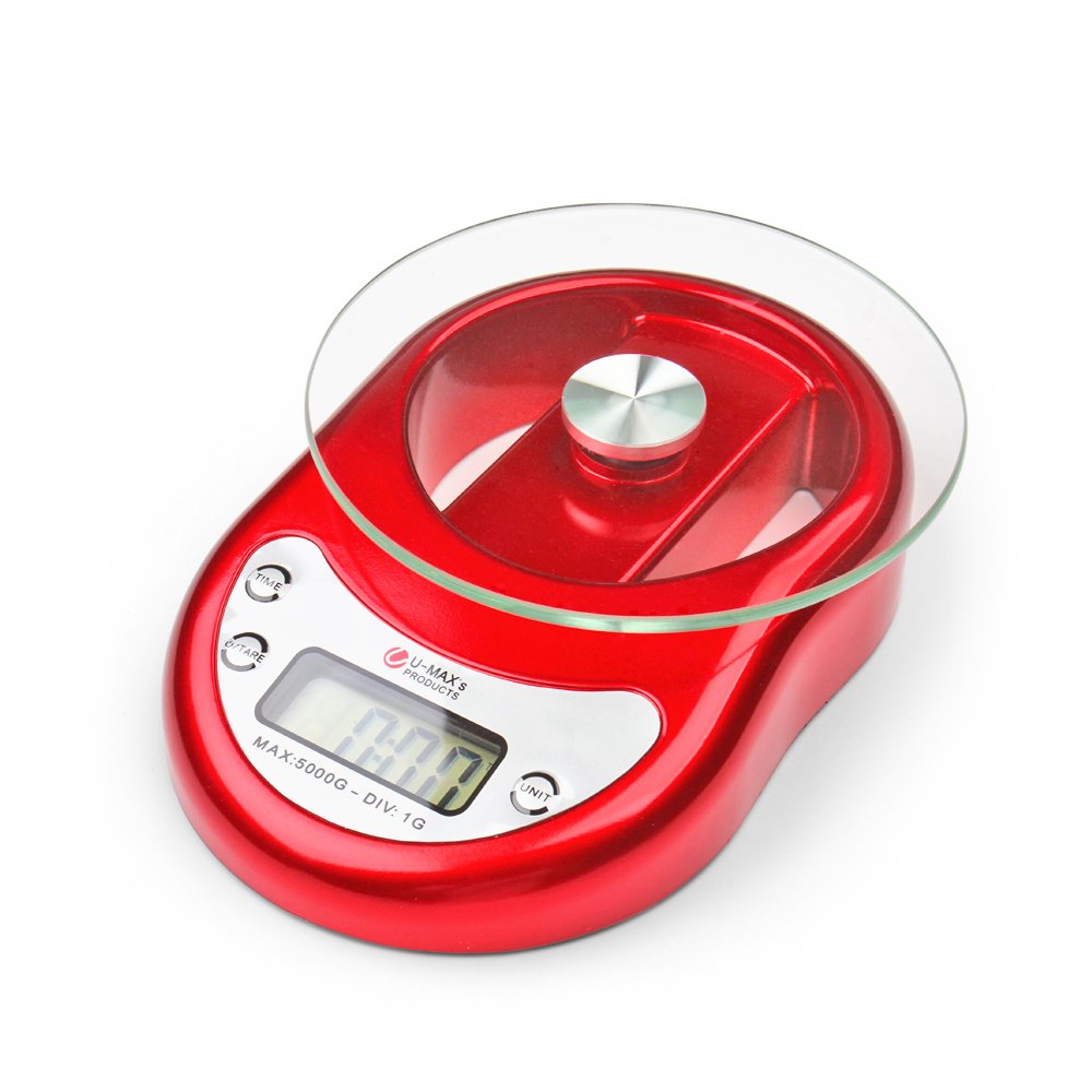 • The Flexzioin Digital Kitchen Food Scale Capacity 5000g x 1g Precision for Cooking Diet Postal Mailing Weighing Electronic with Removable Glass Platform LCD Display in Red is a