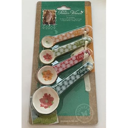 ✔ Engraved Measurement Markings - do not fade, wash off or wear out like printed ones✔ Superior Quality Stainless Steel - Rust Proof✔ Lightweight yet Sturdy and Durable✔ Food grade vibrant color silicone which offers firm grip and stylish look✔ Precision engineering to ensure accurate measurements✔ Ideal shape to easily stack them into each other for easy storage✔ Removable Silicone Grip for Ease of Cleaning✔ Sturdy Locking Rings to Hold corresponding pieces together✔ Elegant Surface Finish✔ Easy Measurements - Set of 10 different pieces to let you take a range of measurements✔ Long, narrow measuring spoons to fit into small spice jarsthe Pioneer Woman Happiness Measuring Spoons Modernize your home kitchen with user-friendly portioning simplicity. Easily measure your garnishes and ingredients by grams, milliliters, pounds and ounces with the quick unit conversion button. The digital scale features a handy auto-tare function so you can easily measure ingredients in a dish without having to do any math, so you can cut down on prep time to enjoy your meal. The scale is designed with a smooth stainless steel platform for easy cleaning and maintenance. Accent your countertop with a modern look. Otherwise, the slim design makes it easy to store in any kitchen cabinet or drawer. Although the scale is slim, it maintains the durability to withstand up to 11 pounds of weight. When the capacity is surpassed, the scale will alert you with a safe overload indication. Whether you're a beginner or a seasoned chef, this digital scale has the simplicity and practicality to create the perfect kitchen creations.Pioneer Woman Happiness Measuring Spoons is best for you4 piece measuring spoons Microwave safe Dishwasher safe Each spoon has a different color poinsettia