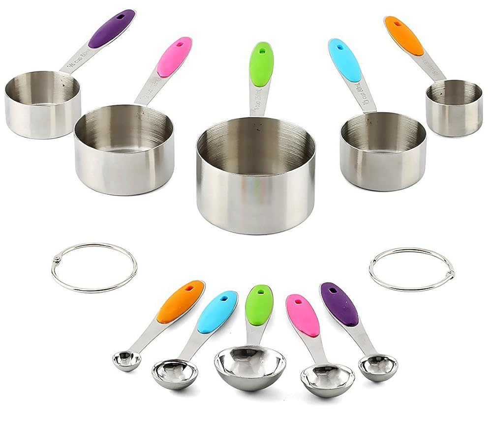 • The Professional Stainless Steel Measuring Cups and Measuring Spoons Set - 10 Piece Stackable Measuring Set with Soft Silicone Handles to Measure Dry and Liquid Ingredients, (Multi Color) is a